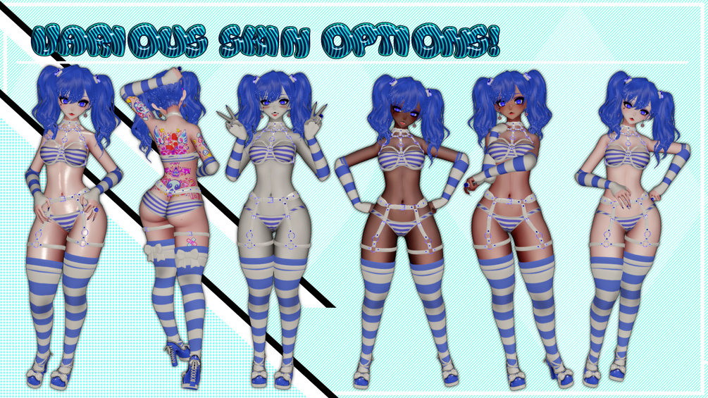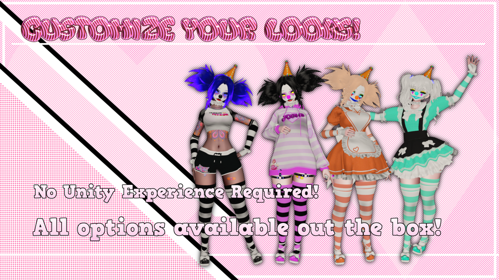 An all in one VRChat avatar featuring multiple outfits for any occasion and packed full of cosmetic adjustments to drastically change your look on the fly and to suit any environment.