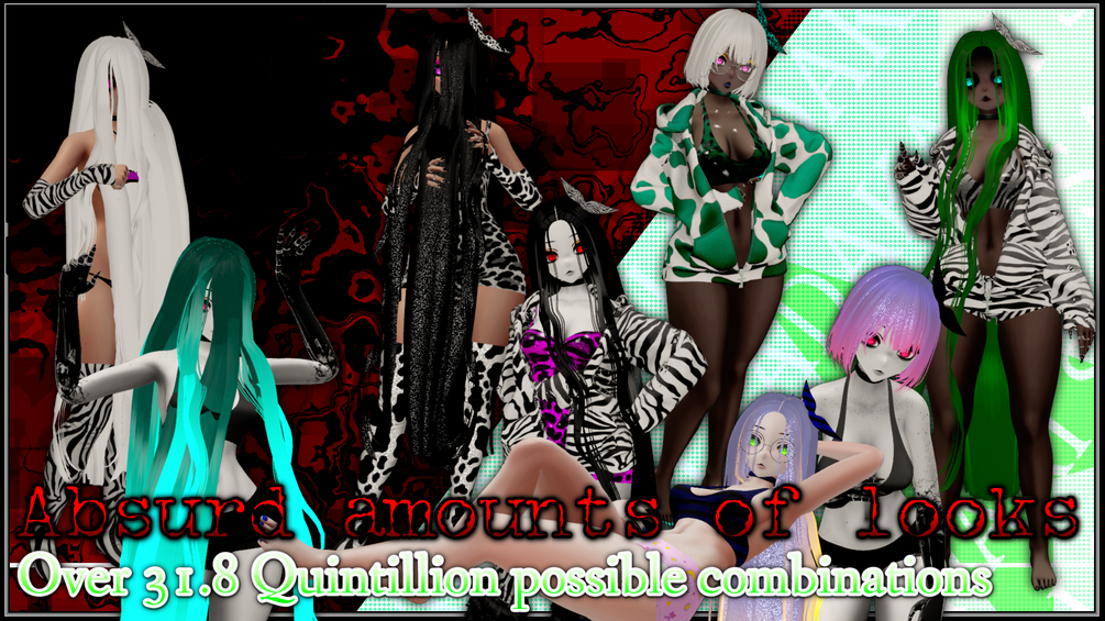 An all in one VRChat avatar featuring multiple outfits for any occasion and packed full of cosmetic adjustments to drastically change your look on the fly and to suit any environment this time with a randomizer button! Not sure what you want to look like? Just spam a button till you like it!!!